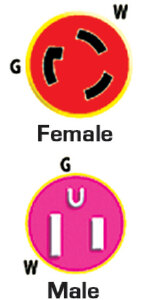 Feature power indicator light, contoured grip and thumbprint ground blade locator. Yellow. (104SPP & 150SPP female connector is locking with sealing collar, the male is straight blade with locking screw).