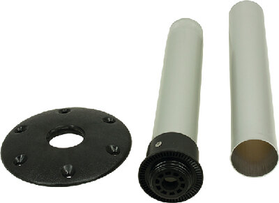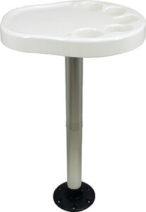 Party Platter table top includes 5 built-in cup holders. Plastic table mount is built into the table top to accept the anodized aluminum Thread-Lock™ Post. Surface mount black plastic Thread-Lock™ base. Package includes table, 27\" post, and base.