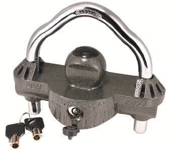 One size fits all! Fits all coupler types in sizes 1-7/8\", 2\" and 2-5/16\". Has a hardened 5/8\"-16mm steel shackle. With rugged corrosion resistant finish. A key hole cover helps seal out dirt and grime. Reinforced armored shoulder guard resists hammer strikes and saw cuts.