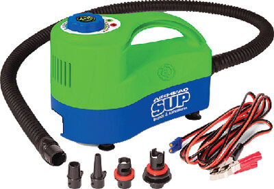Fill up inflatable stand up paddleboards. It features alligator clips and a 10\' cable for direct battery connection. There\'s also a locking 50\" hose with interchangeable H-Valve, Leafield C7, Speed Safety Valve, and mini Speed Safety Valve Adaptors. The auto shutoff is easy to master; simply dial the pressure from 1 to 20 psi. Includes a mesh storage bag.