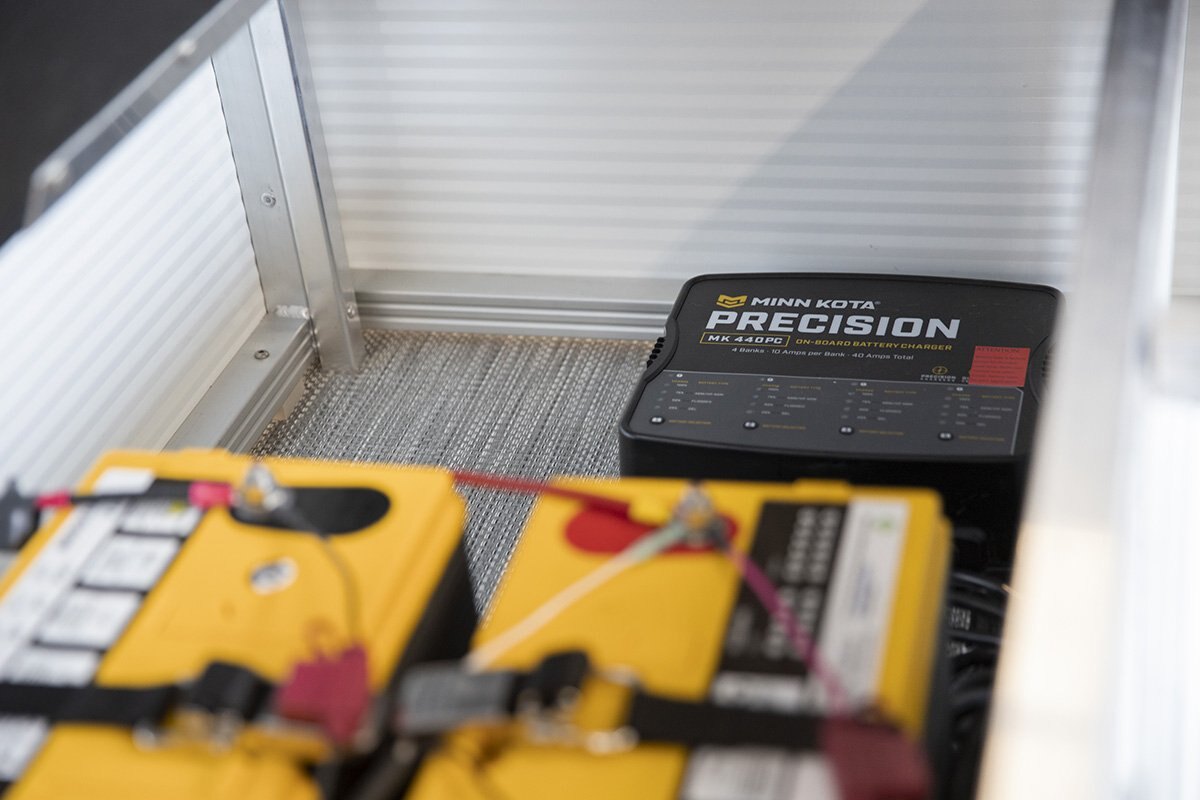 The E-Kolo is the perfect pontoon for non-gasoline lakes or ecological lakes. This is a 100% electric model and it is equipped with a MinnKota E-Drive engine that can reach a speed of 5 MPH in calm water.