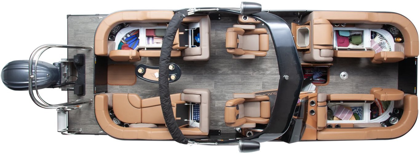 Twin bow couches provide comfortable seating with built-in cupholders, USB ports, and integrated speakers. Custom SunCatcher wave branding adds a stylish, personalized touch.